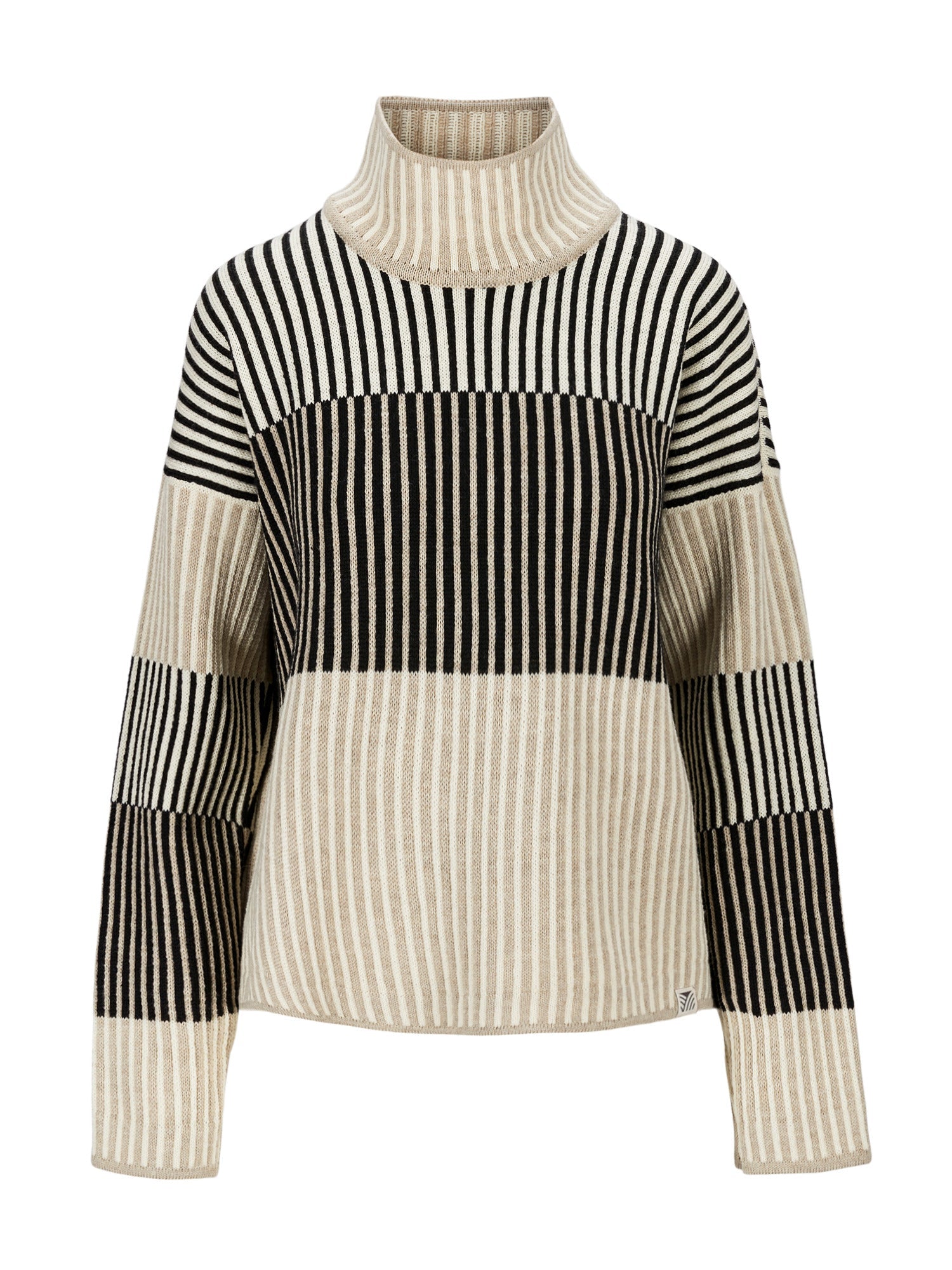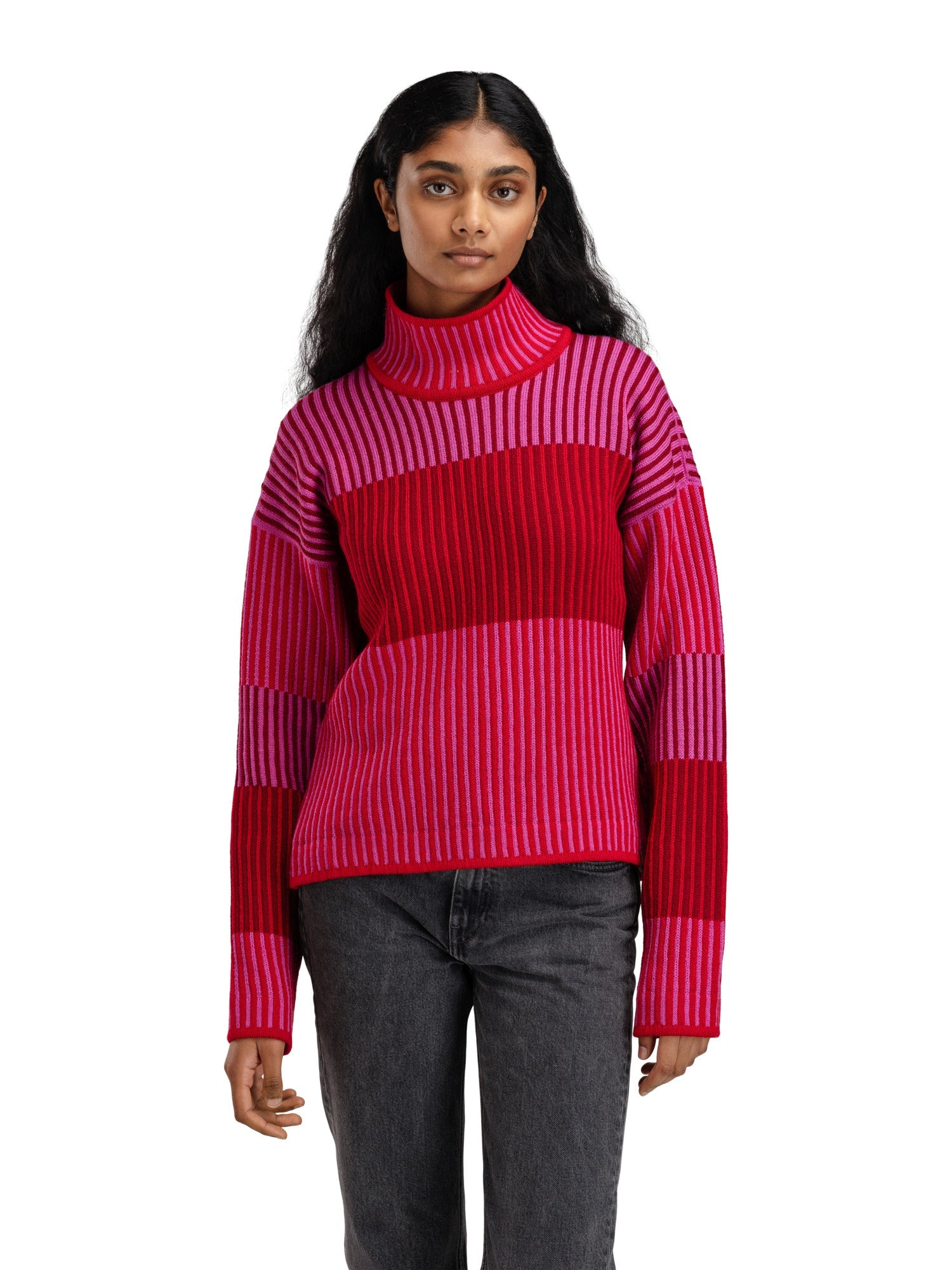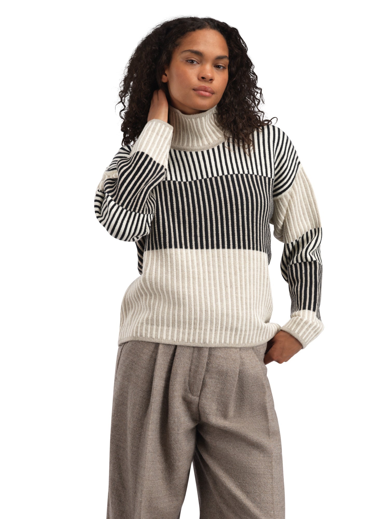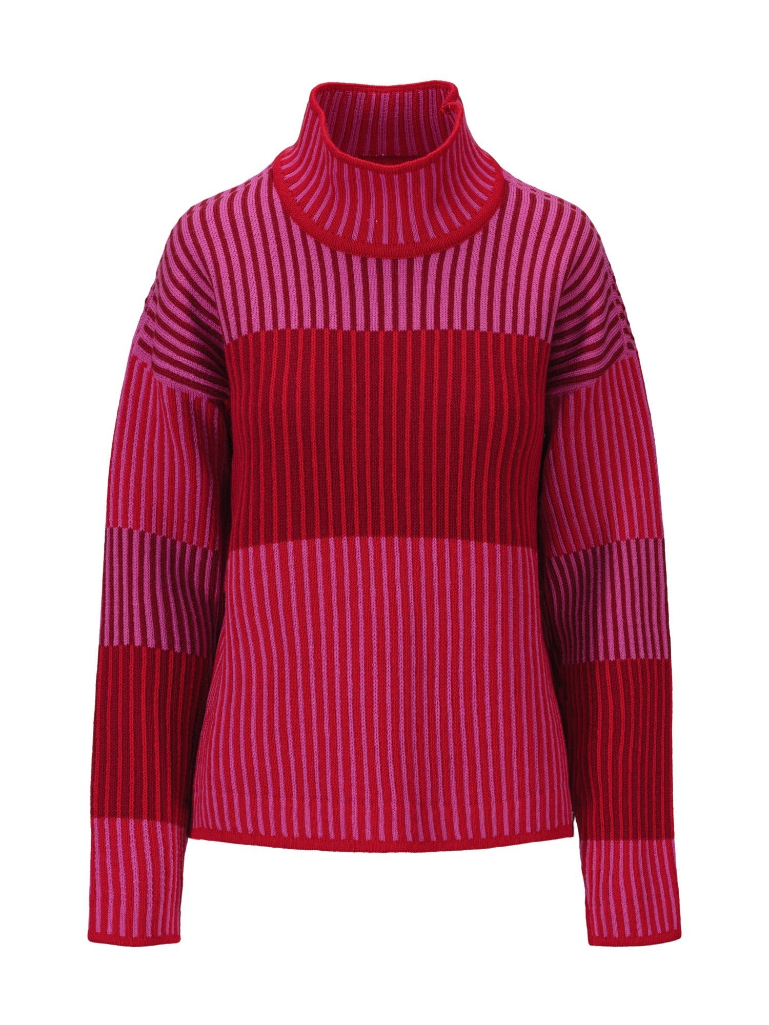 Ein verspielter Pullover mit einer entspannten, überschnittenen Schulter, die eine weite Passform verleiht. Der Pullover ist in einer tonalen Palette gestrickt und hat einen strukturierten Effekt, der wie eine Rippe aussieht. Trotz des geteilten Looks sind Vorder- und Rückseite sowie die Ärmel des Pullovers als ganze Teile gestrickt. Der hohe Halsausschnitt ist einfach gestrickt und hat eine weite Form für Komfort und Platz.