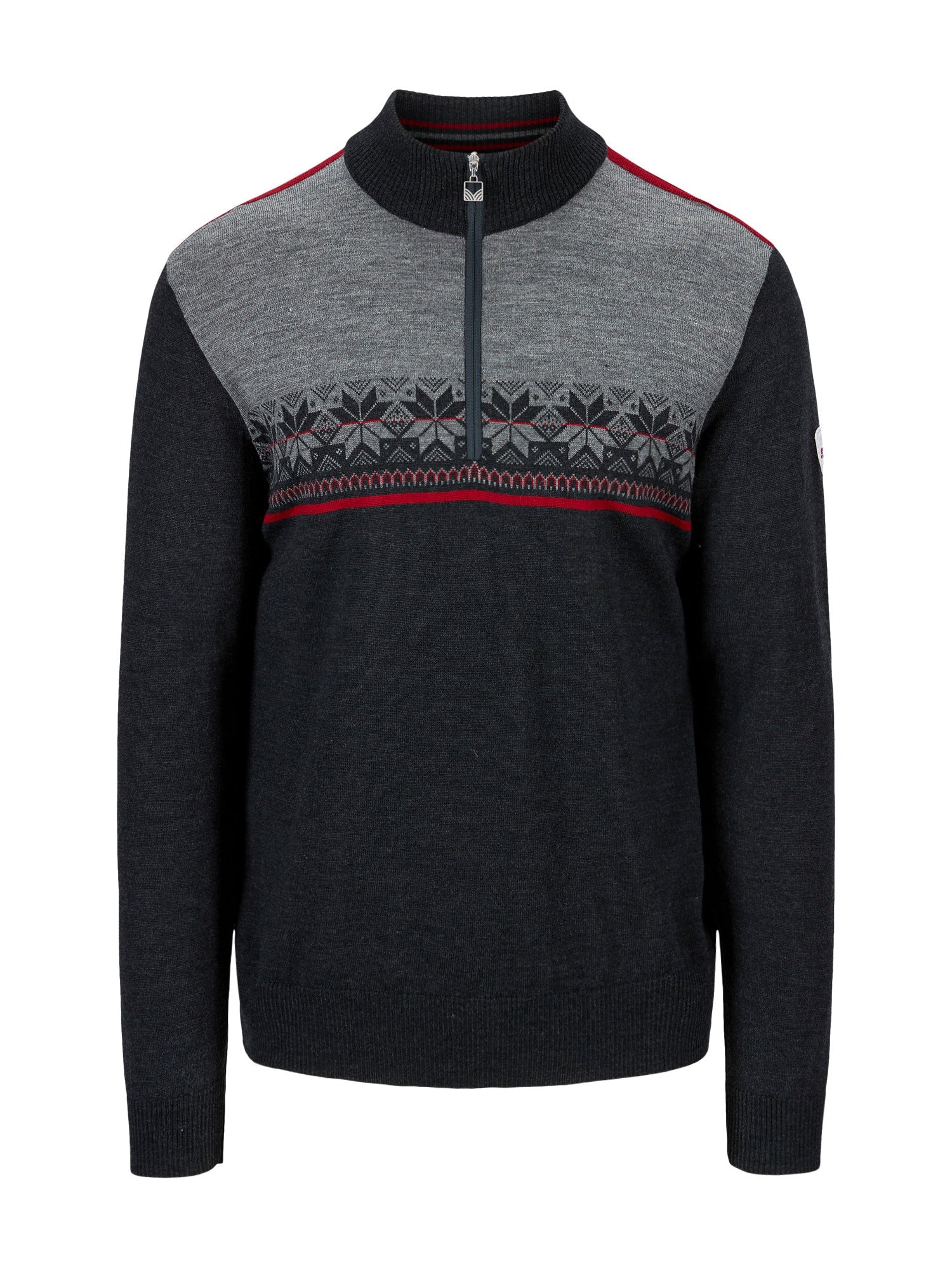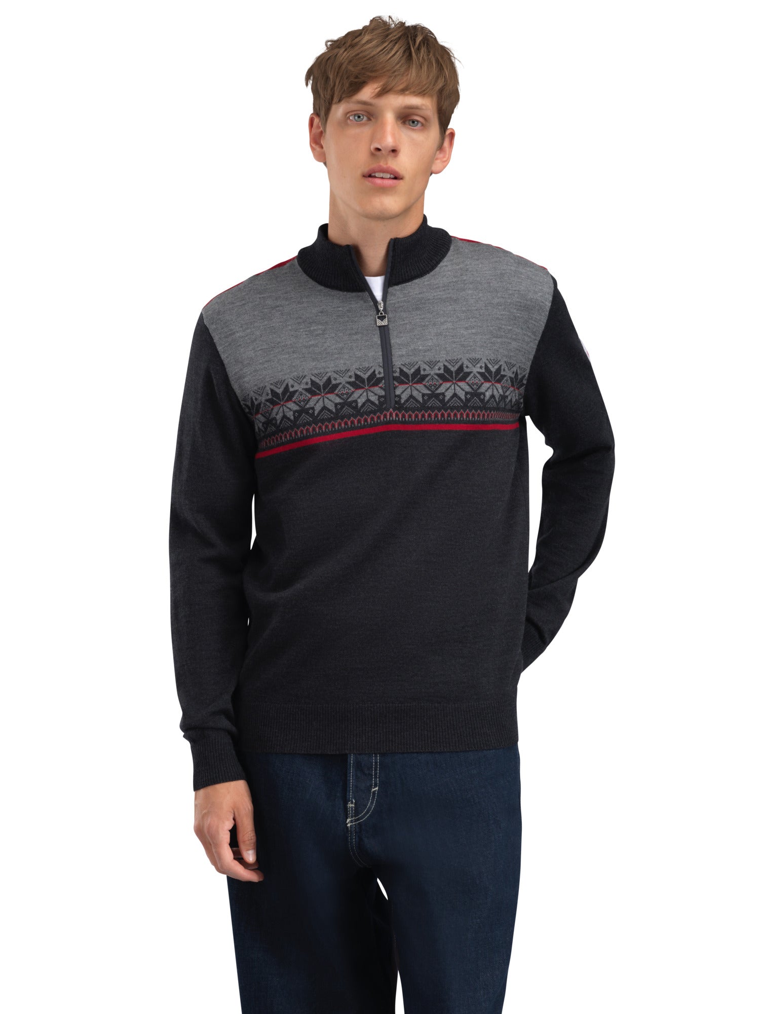 Ein sportlicher, leichter und weicher Pullover aus Merinowolle mit Blockfarben und Muster mit der klassischen achtblättrigen Rose.