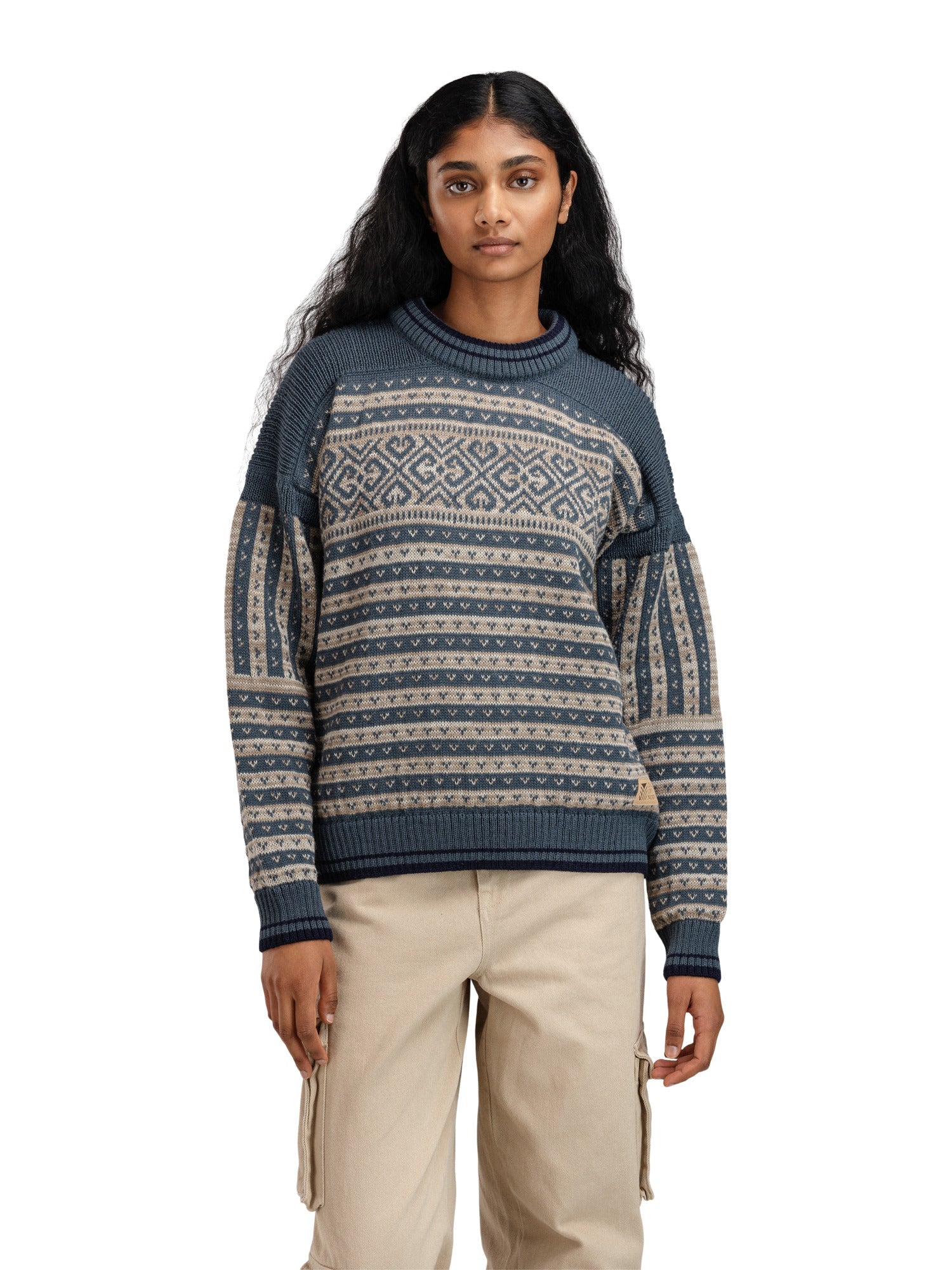 De Ramberg-trui geeft een tijdloos ontwerp een unieke urban vibe. Met zijn relaxte pasvorm, geribde schouderdetails die de oversized schouder benadrukken en opvallende contrasterende strepen bij de hals, mouwen en onderkant, combineert Ramberg moeiteloos klassiek en modern. Geïnspireerd door de historische Fana-trui, geeft Ramberg een nieuwe draai aan dit historische kledingstuk voor vandaag. De klassieke strepen worden geüpdatet met een afgerond, achtbladig rozenontwerp rond de borst en een traditioneel luizenpatroon, terwijl schouderaccenten en geribde boorden een frisse, dynamische touch geven. Meerdere garenkleuren worden gemengd in de garenmix en geven de Ramberg een levendig, stedelijk karakter.