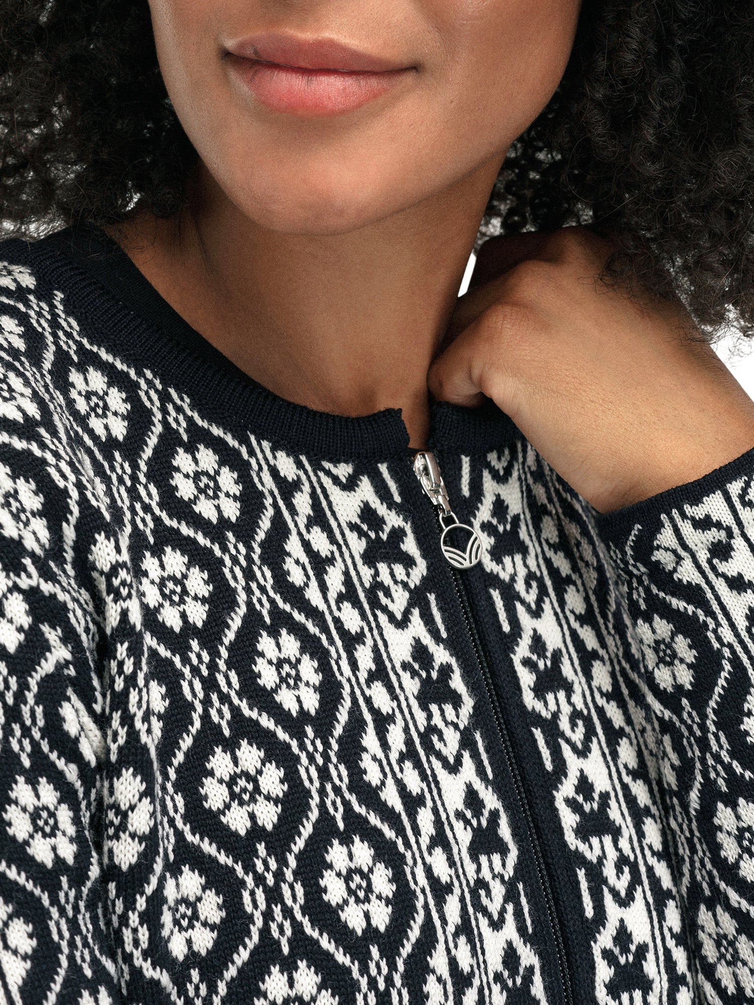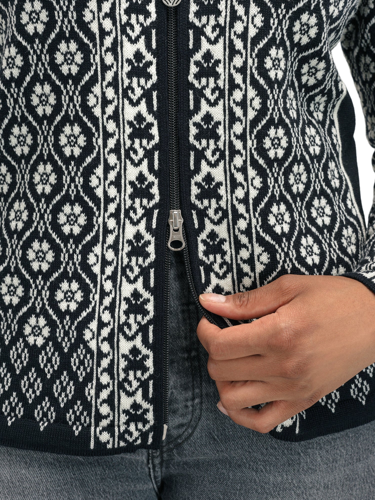 Lichte en gedetailleerde wollen jas met een slanke pasvorm en zijpanelen met een flatterende vorm. Het rozenpatroon is geïnspireerd op een variant van de Trønderbunad, een nationale klederdracht uit Trøndelag. De jas heeft een tweewegritssluiting en is gemaakt van 100% zachte merinowol.