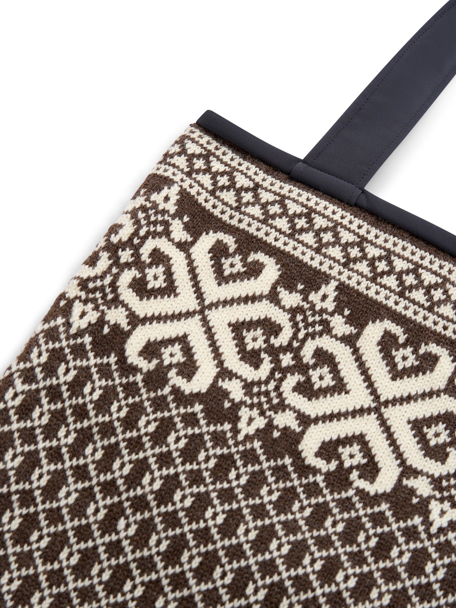 Eine detailreiche, gemusterte Tragetasche aus ungefärbter Wolle mit traditionellem norwegischem Design. Diese geräumige Tasche bietet Platz für so ziemlich alles, was Sie im Alltag brauchen, und verfügt über eine kleine Innentasche für das Nötigste. Sie ist aus 100 % leichter, ungefärbter Wolle gestrickt und mit einem winddichten Stoff aus unserer winddichten Kollektion gefüttert. Die Tasche ist auch wendbar, wenn Sie einen dezenteren Look bevorzugen.