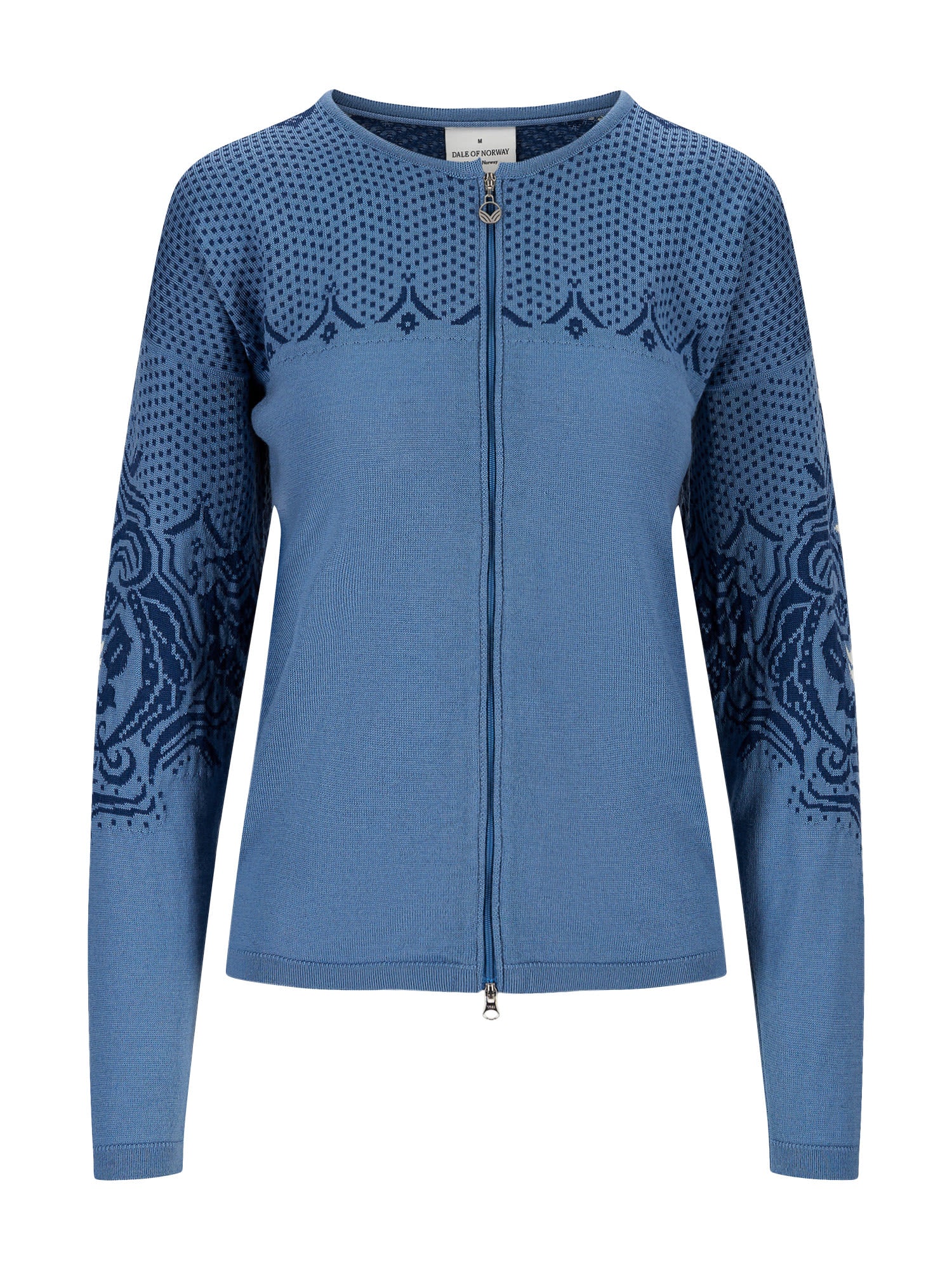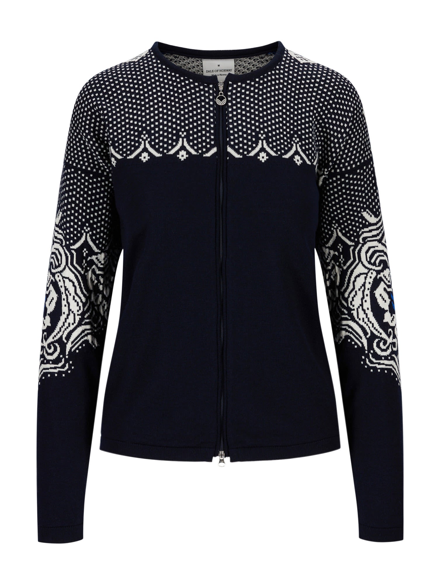 Die Rosendal Jacket von DALE OF NORWAY für Damen hat ein umfangreiches, detailliertes Blumenmuster, das auf den alten Dale-Mustern basiert, kombiniert mit dem traditionellen Läusemuster an den Schultern.